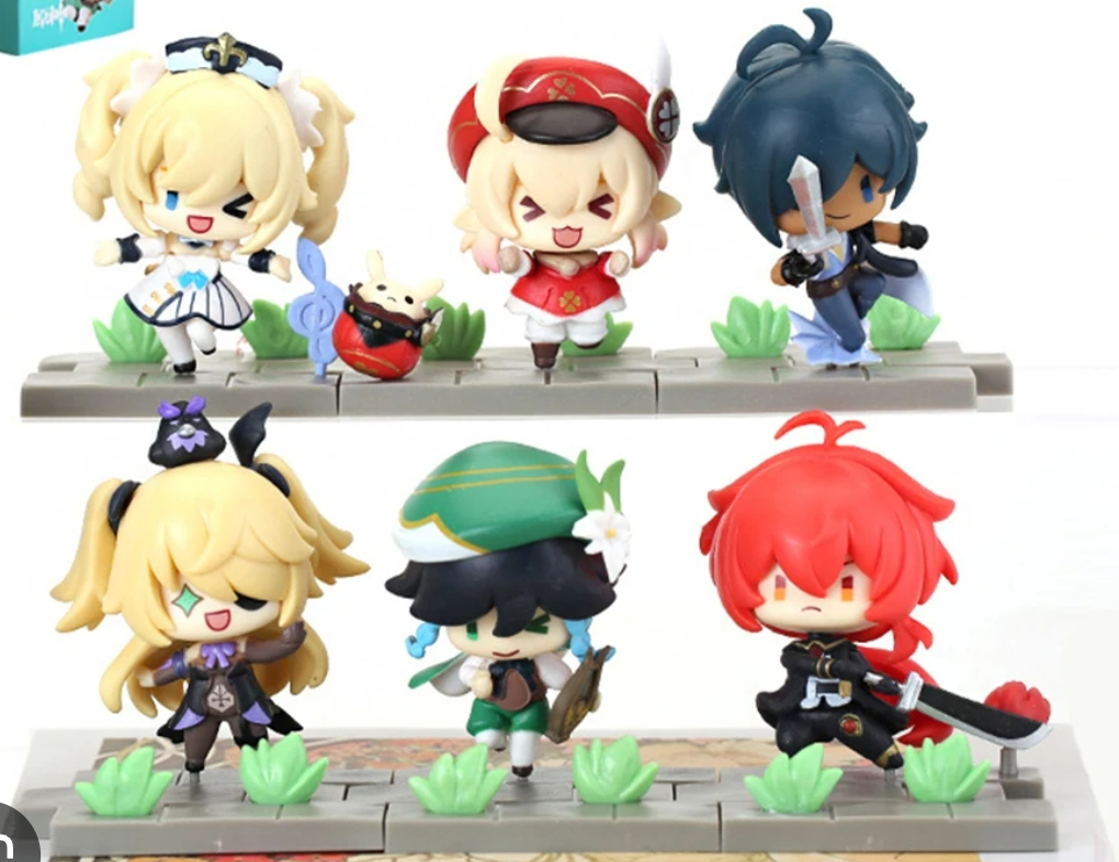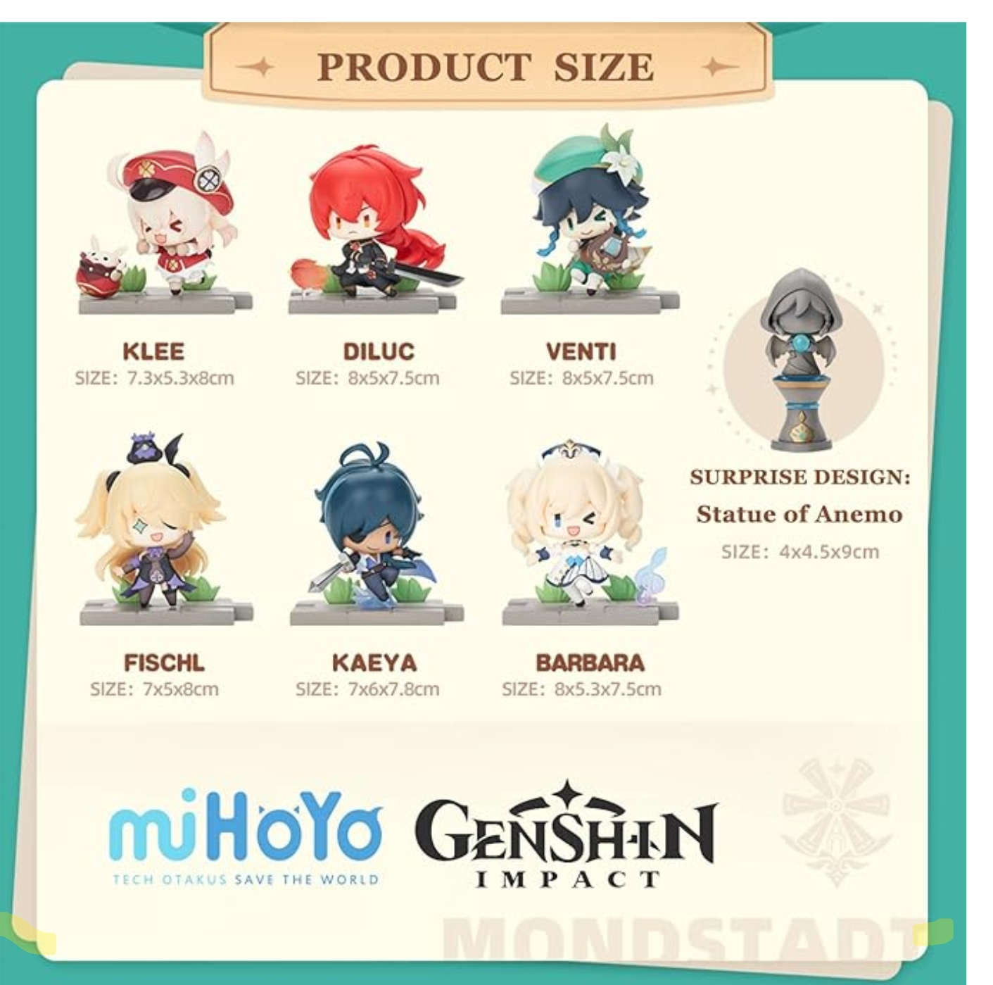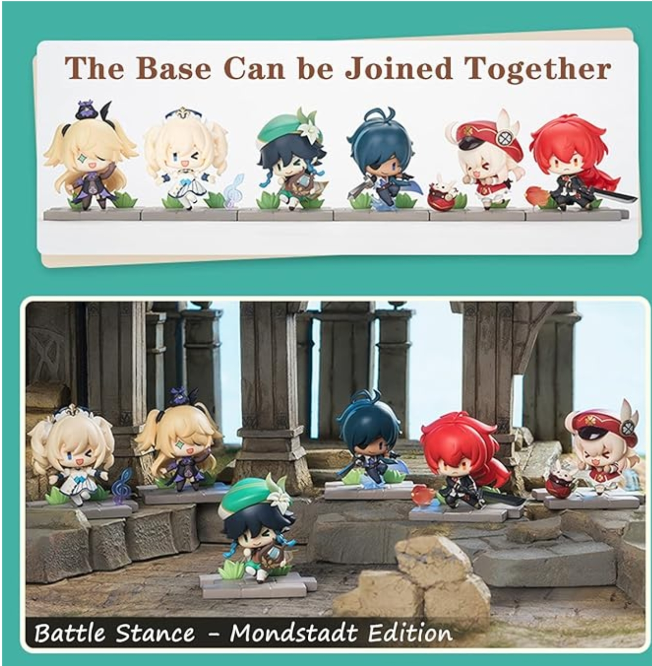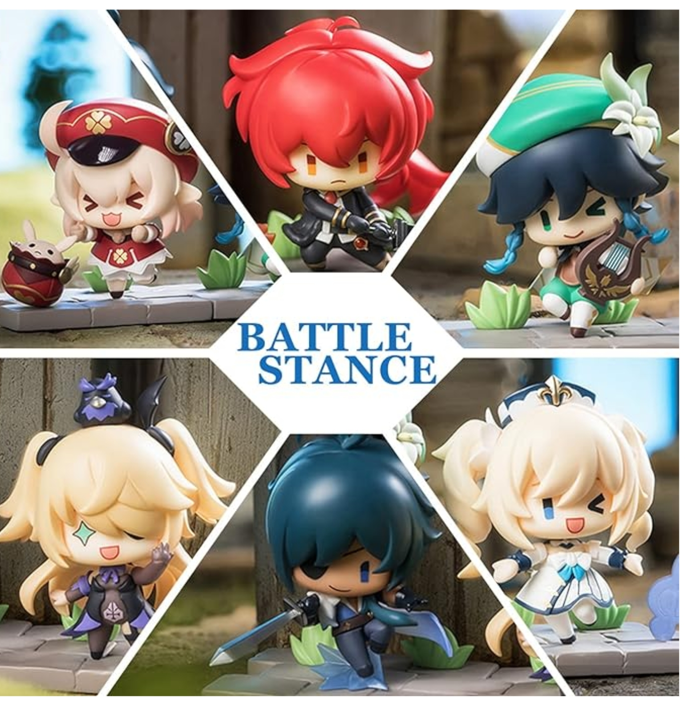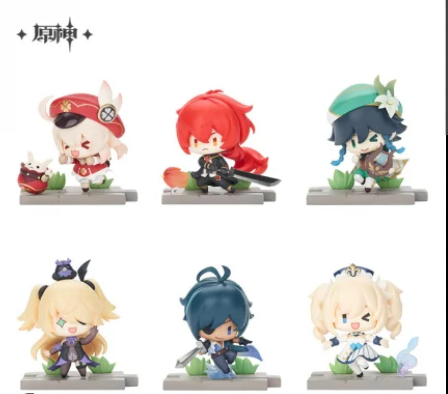 A coleção oficial de chibis, inspirada pelo jogo Genshin Impact. Bonecos que podem ser encaixados através de suas bases vendidas separadamente ou como um conjunto. São seis heróis: Barbara, Klee, Kaeya, Diluc, Venti e Fischl. Na compra do set completo, a estátua dos deuses vem como brinde!